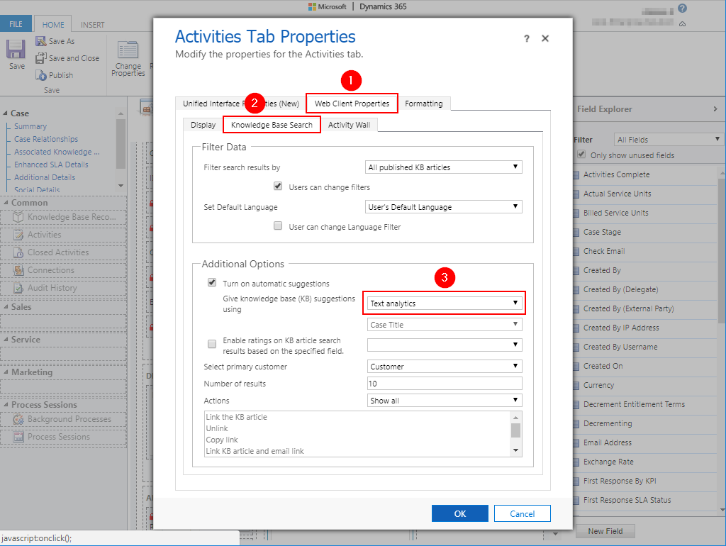 Configure the KB Article search on Case Form. Open a case form for customization and change properties of “Activities Tab” as shown below.