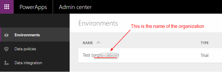 When you go to admin.powerapps.com, you can create your own Environment. Under this environment, you can then provision a Database. You can add users and provide security roles to users. You can add Apps and Flows and manage solutions. When you create an environment, you are essentially creating a new “Organization” with base CDS entities that have a unique OrgName (as shown below).