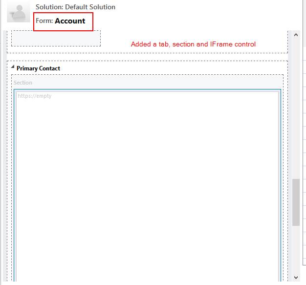 Now, you will need to write a javascript that will be added to the parent form (in this case Account form). This javascript will run on parent Form’s OnLoad event and will identify the primary contact id and frame the URL that needs to be set on the IFrame. You may also need to handle the null exceptions.
