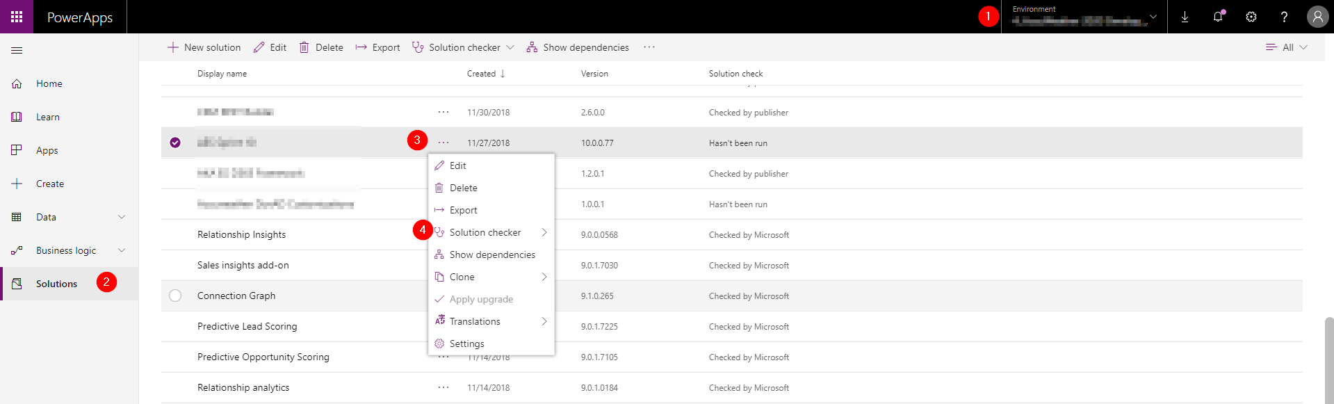 Once you have selected your solution on which you want to run the analysis expand the Solution Checker from the popup menu and click “Run”.