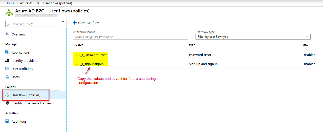 | Authentication/OpenIdConnect/Azure AD B2C/DefaultPolicyId | B2C_1_signupsignin<name of the signup-signin user flow> |