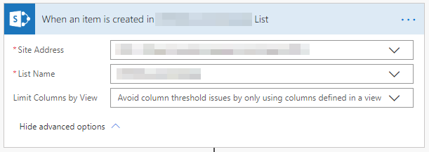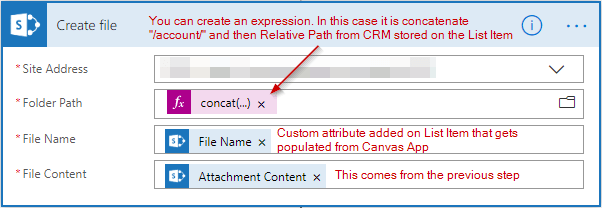 When an item is created in SharePoint list this Flow will be triggered. It takes in two required parameters; Site Address – which is the SharePoint site address configured with CRM, List Name – the temporary list created that is bound with the Canvas App.
