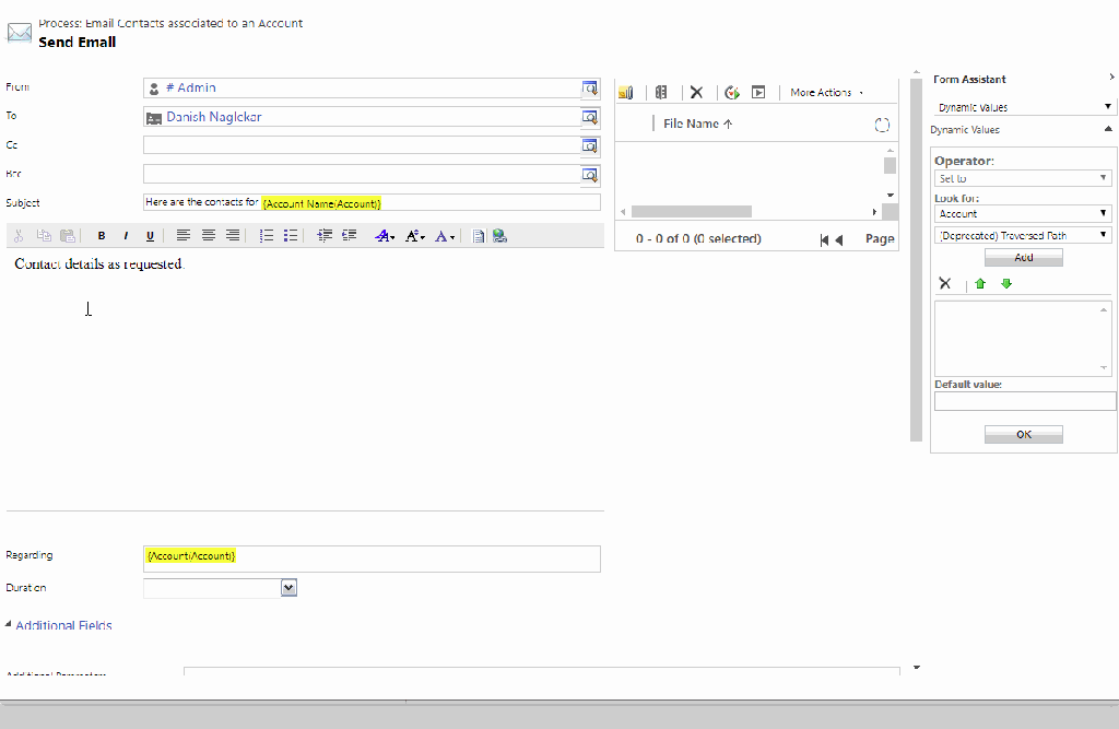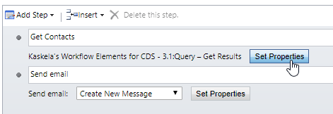 Now, let’s setup the workflow. I named my workflow as “Email Contacts associated to an Account” and made it on-demand; so that I can execute it from any Account. I then added a step from Kaskela Workflow Elements named “Get Results” and set it’s properties. The only thing I changed from the properties was “Fetch XML”. I added the above formatted Fetch XML here.