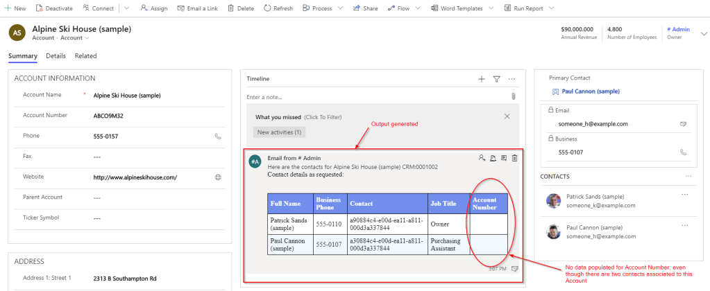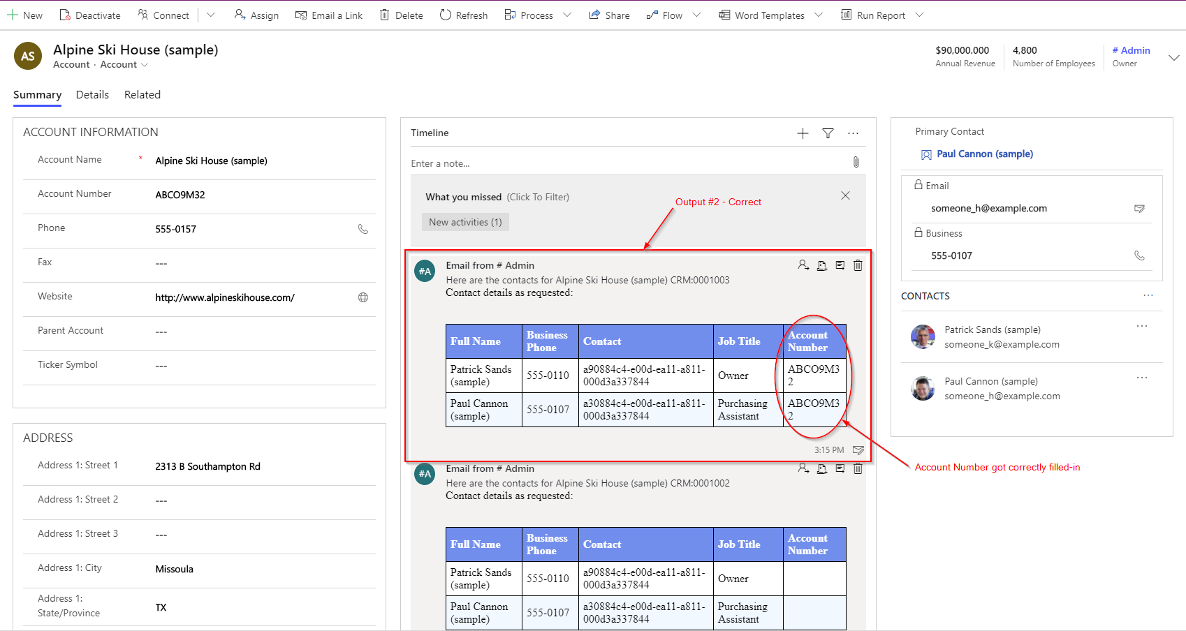 After activating the workflow and running it on account “Alpine Ski House” we get following output.