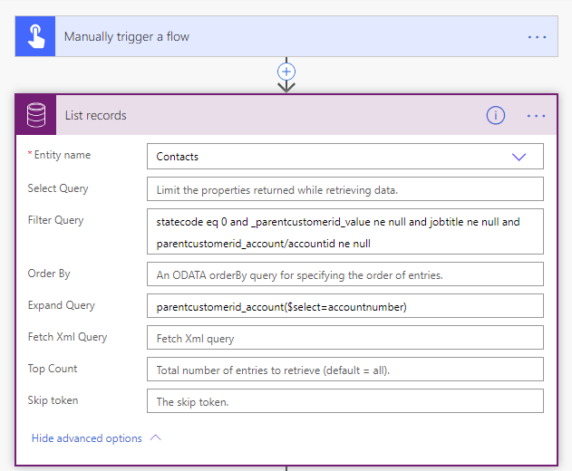 Now, let’s add a List Record query to get all the Contacts with some filters. In my case, I have added a filter to fetch active contacts that have parent customer id and job title populated. And I want to fetch account number from parent customer id (account); for that I have used expand query. To get my filter and expand query I have used “FetchXML Builder” tool from XrmToolbox.