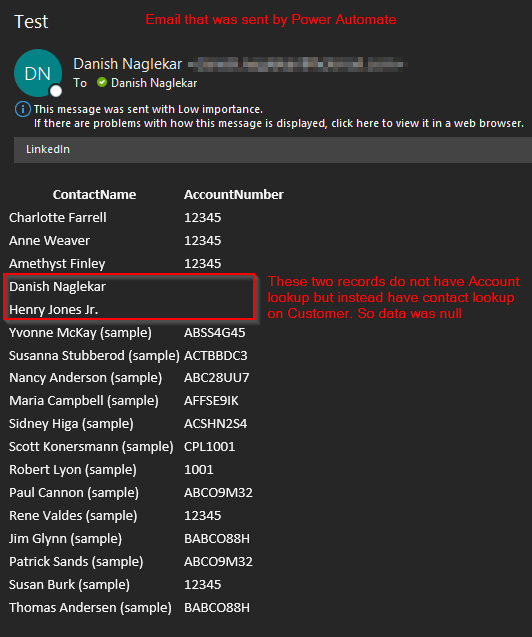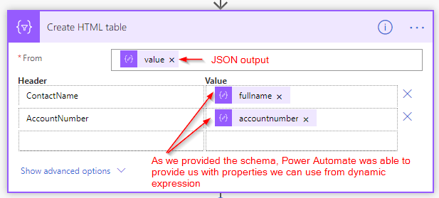 Using the above mentioned action makes things easier to get properties from the JSON object. In my example I want to send an HTML table via email. So, I used “Create HTML table” action and passed my JSON output and added some custom columns to the table that will display the data I want from Customer Lookup attribute. As we had provided the schema for “Parse JSON” action Power Automate was able to provide us with all the properties from the JSON output which we can use it in our “Create HTML table” action. In my case I wanted to send an email with Contact Name and Account Number in a table format. So, I created my table with two columns ContactName, AccountNumber and passed fullname, accountnumber properties from my JSON object as the row value.