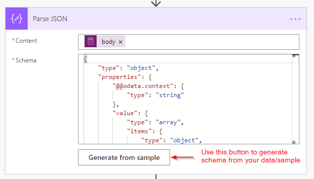 With this JSON data, I added my next action “Parse JSON” and used “Generate from sample” button and entered my JSON data that I had captured earlier. This generated my schema for Parse JSON action.
