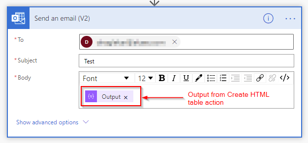 The output of the “Create HTML table” was then added to send email action – creating a nice table in the email.