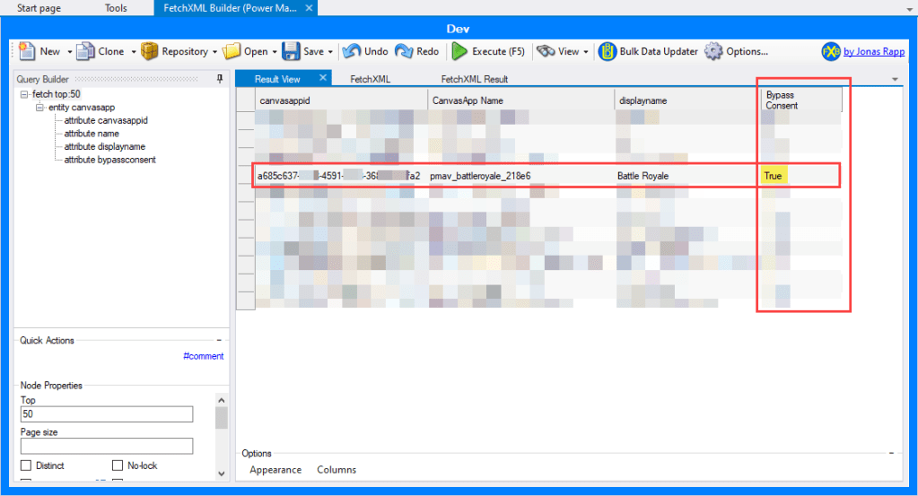 Now, that you executed the script; but how do you make sure if it is working correctly. Easy, head over to Fetch XML Builder in XrmToolBox and fetch data from entity “canvasapps” with attributes such as name, displayname, bypassconsent like shown in the screenshot below: