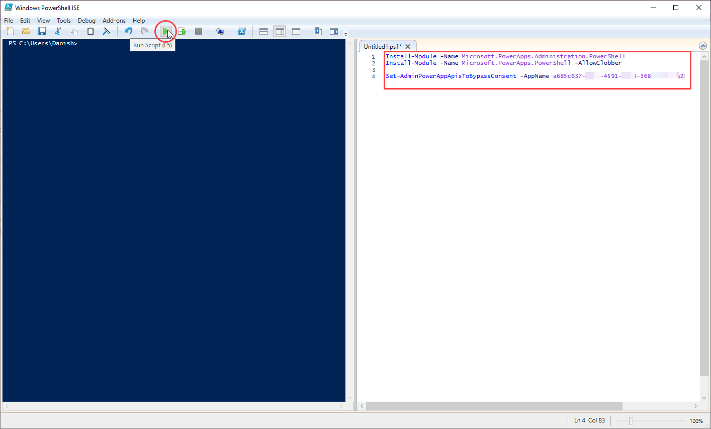 Now that we have the App Id, we need to run the PowerShell Script that will enable bypassing the consent popup. You can find the script below: