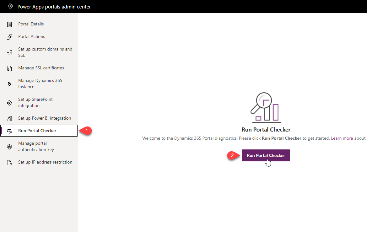Look for Run Portal Checker option on the left-hand menu items. Selecting the option should show the Portal Checker page with Run Portal Checker button. Click this button to run the diagnostics on your portal.