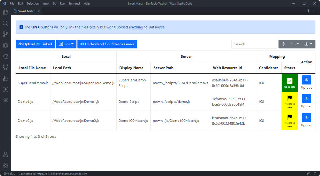 New and improved icons were added that provide more context. For example, if you have connected to an environment on a folder/workspace then it will show a green Dataverse icon and the environments not connected on the current folder/workspace will be shown as red. The same goes for Web Resource files. The ones that are linked with local files will show as green and the rest will show as red.